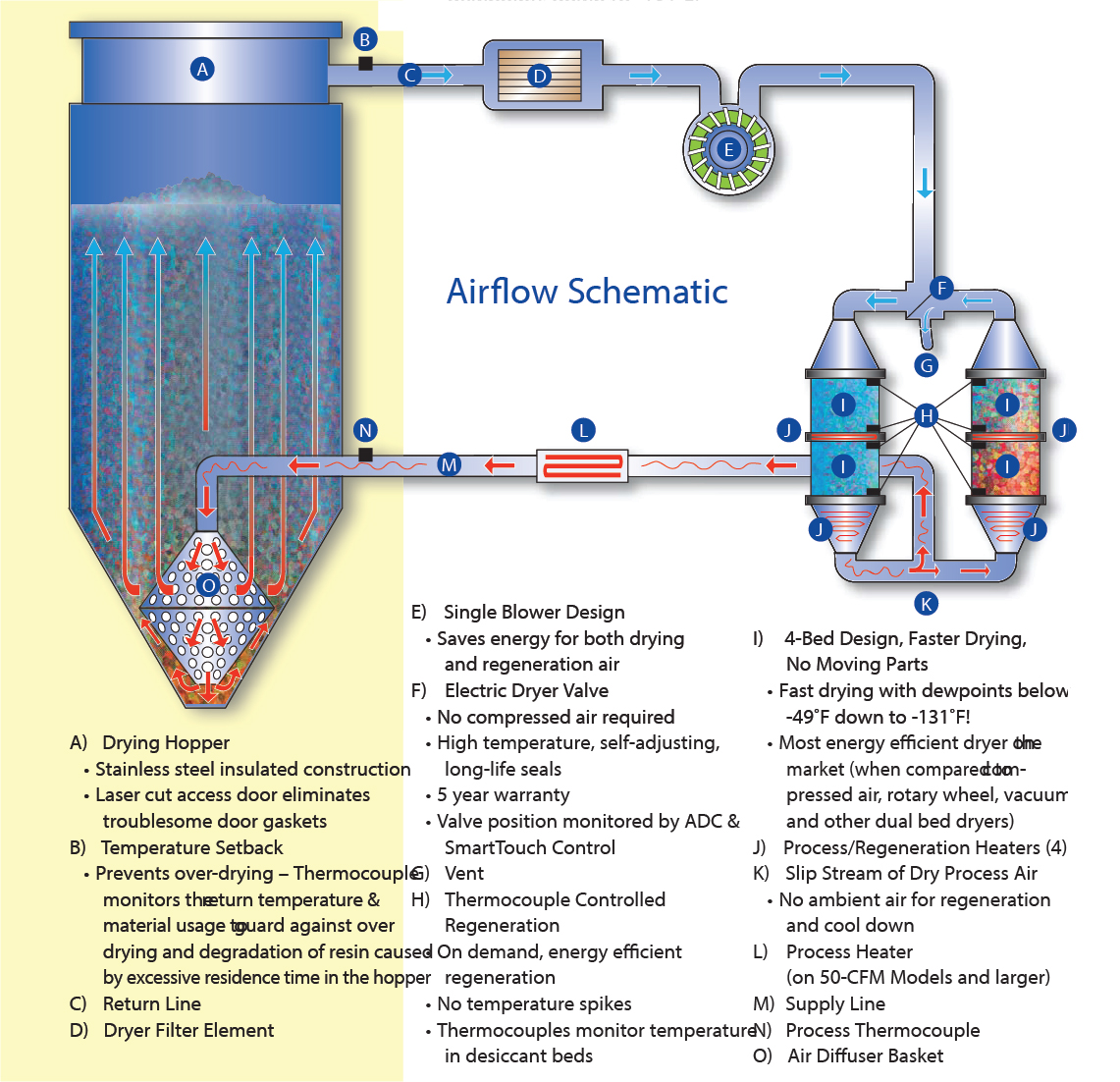 More efficient, more air flow, and lower dewpoints equal faster, more energy efficient drying than wheel and compressed air dryers. Dri-Air HPD dryers include out patented 4 bed dryer, drying hopping and optional closed loop loading systems, eliminating press/extruder mounted drying hoppers, for fast, safe material changes.